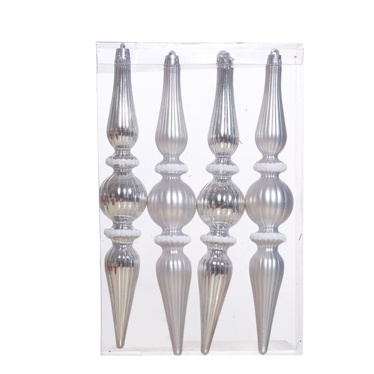 Este set de cuatro varitas colgantes plateadas de MIRO ofrece una alternativa elegante a los adornos redondos tradicionales. Fabricadas en Plástico, su diseño estilizado y alargado añade una sensación de altura y movimiento a las ramas de su árbol. El acabado plateado brillante es perfecto para capturar y reflejar las luces, maximizando la luminosidad de su decoración.
