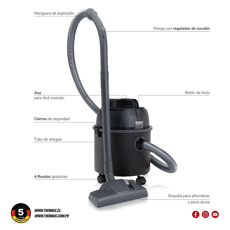 La Aspiradora Thomas Junior TH-1216 es un equipo robusto y eficiente, diseñado para enfrentar tareas de limpieza exigentes tanto con polvo como con líquidos. Su potente motor de 1200 watts y tecnología intercooler permite hasta 4 horas de uso continuo sin sobrecalentarse, ideal para jornadas extensas de limpieza.