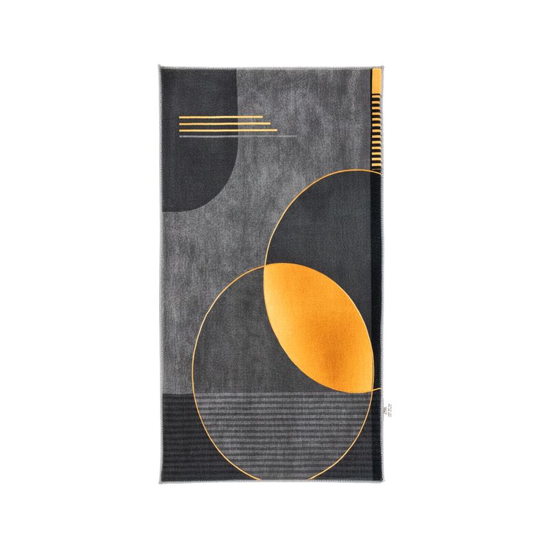 La bajada de cama Casa Viva con diseño de círculos abstractos destaca por su textura suave tipo cachemira y su combinación de tonos grises con amarillo, que aportan armonía y estilo al dormitorio. Su superficie agradable al tacto ofrece una experiencia cálida en cada paso.
