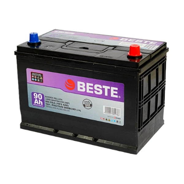 La batería automotriz Beste 12V 90Ah está diseñada para almacenar y entregar energía de forma eficiente al motor de partida. Sus 650 CCA permiten un arranque confiable incluso en condiciones exigentes. Es una batería sellada y libre de mantención, lo que facilita su uso diario. Ideal para quienes buscan rendimiento y durabilidad.
