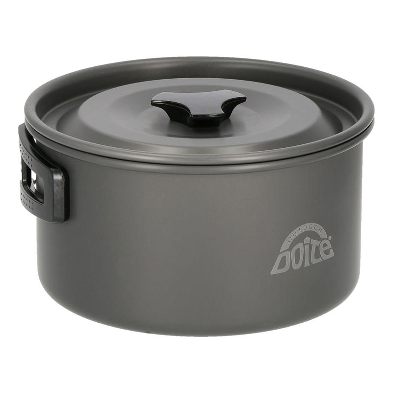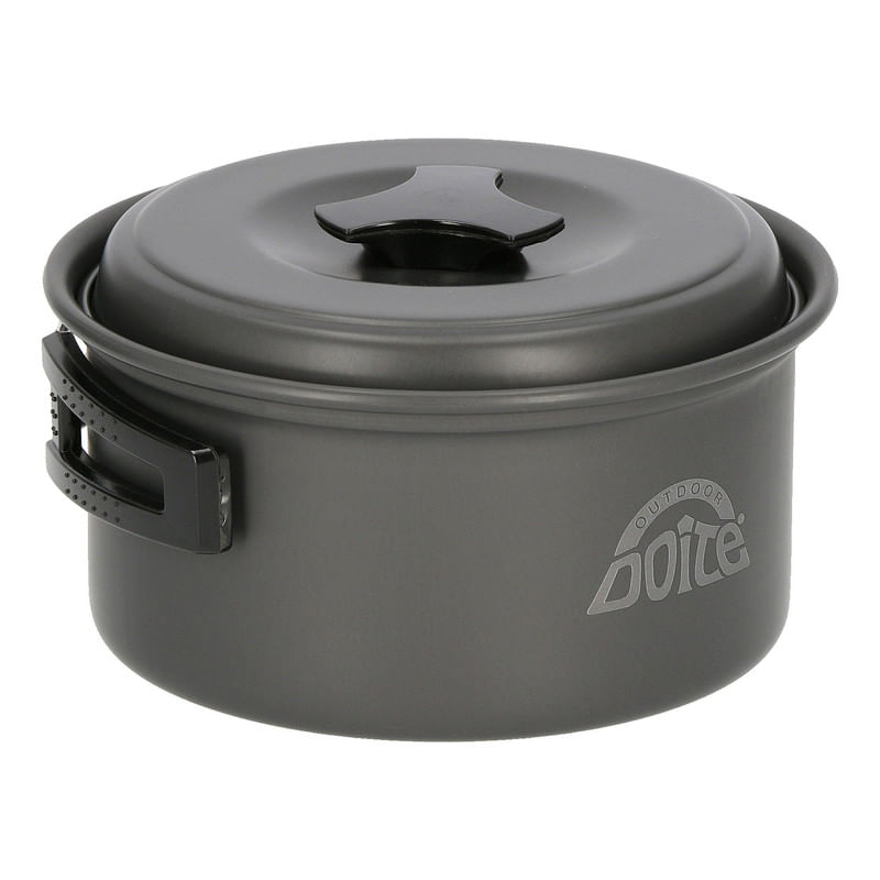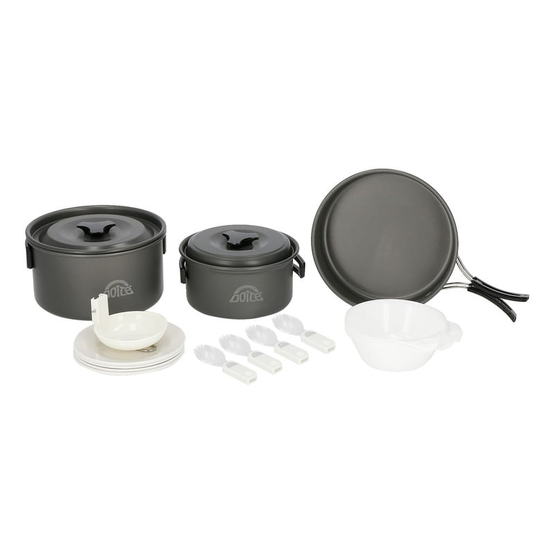 La batería de cocina Cooker Doite para 4 personas está pensada para quienes disfrutan cocinar al aire libre sin sacrificar comodidad ni funcionalidad. Su combinación de aluminio para la cocción y plástico resistente para el servicio permite preparar y compartir comidas de forma práctica en camping, viajes o picnics.