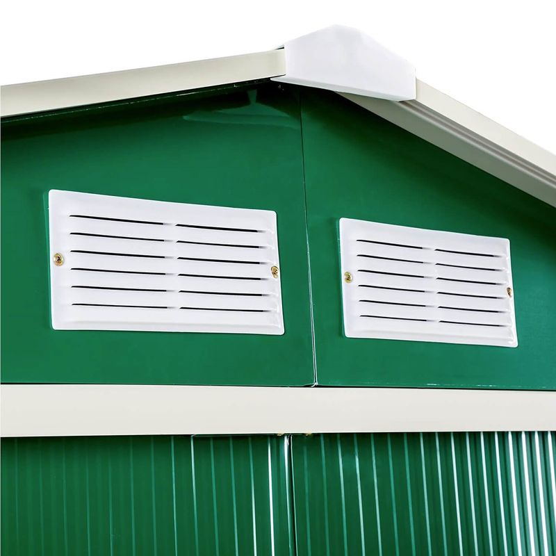 Su diseño incluye dos rejillas de ventilación y un techo a dos aguas, proporcionando una ventilación adecuada y una protección óptima contra las inclemencias del tiempo. Con una capacidad de 2,43 m², ofrece un espacio amplio y organizado para tus necesidades de almacenamiento.