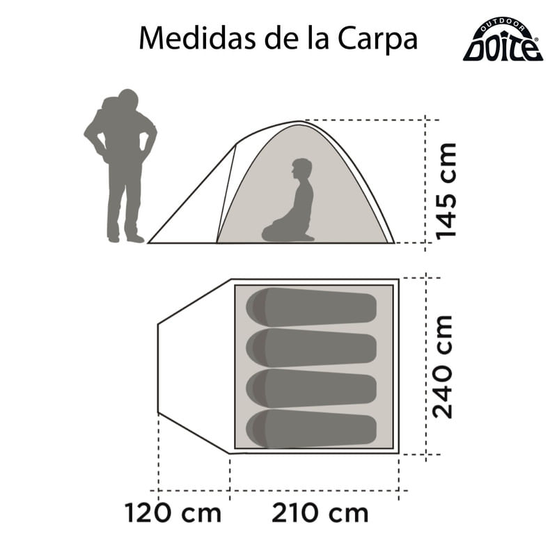 La carpa Hi Camper Doite para 4 personas está diseñada para brindar un equilibrio ideal entre protección, espacio y durabilidad, siendo una excelente opción para camping familiar. Su estructura robusta y su impermeabilidad de 3000 mm en techo y suelo aseguran un interior seco incluso en condiciones climáticas exigentes.