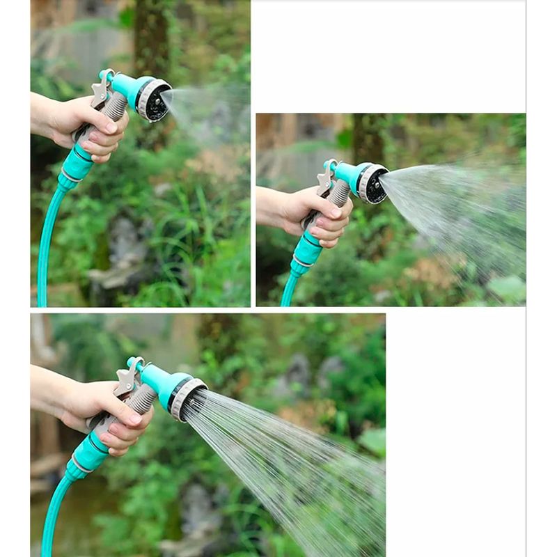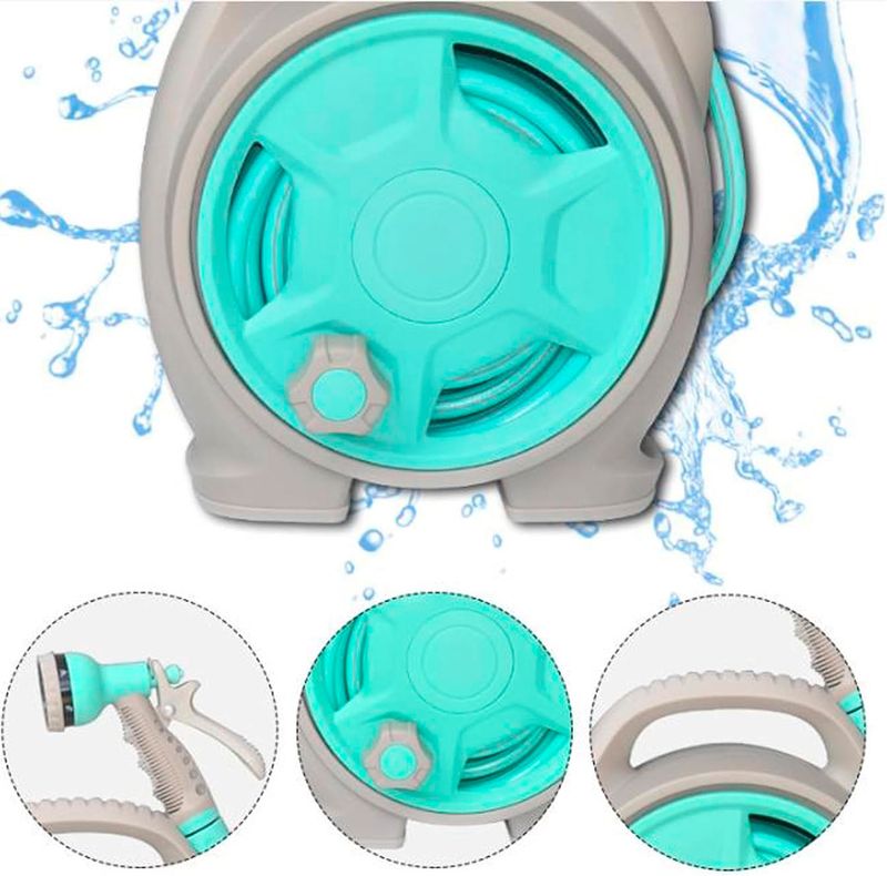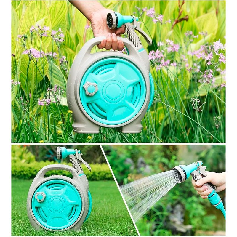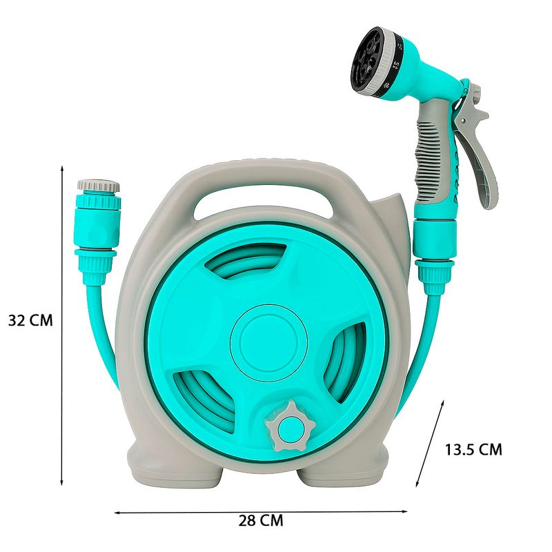 Incluye pistola de pulverización con 6 funciones que se adaptan a diferentes necesidades de riego o lavado, desde un rocío suave hasta un chorro intenso. Con su color turquesa y estructura aerodinámica, es ideal para espacios pequeños y uso móvil.