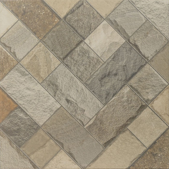 La cerámica Piedra Giza 46x46 cm OCA destaca por su diseño multiformato con disposición diagonal tipo herringbone, logrando un efecto visual dinámico que imita con gran realismo la textura y el relieve de la piedra natural. Sus tonalidades pétreas combinadas con acentos tierra permiten crear ambientes cálidos, modernos y con carácter, ideales para espacios interiores y exteriores techados.