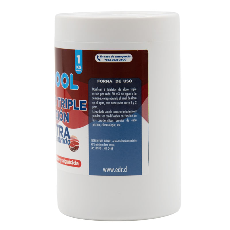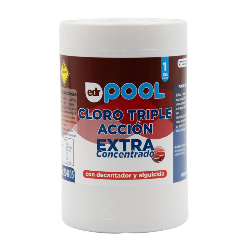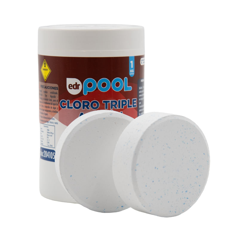 El cloro para piscina en tableta triple acción EDR Pool ofrece una solución integral para el tratamiento del agua, combinando cloración, control de algas, clarificación y estabilización, permitiendo mantener la piscina en óptimas condiciones con una disolución lenta y controlada.