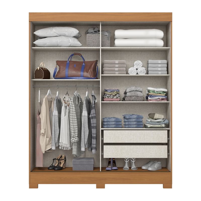 Su interior combina perchero para ropa colgada, repisas laterales y cajones internos que facilitan la organización de prendas y accesorios de forma práctica.