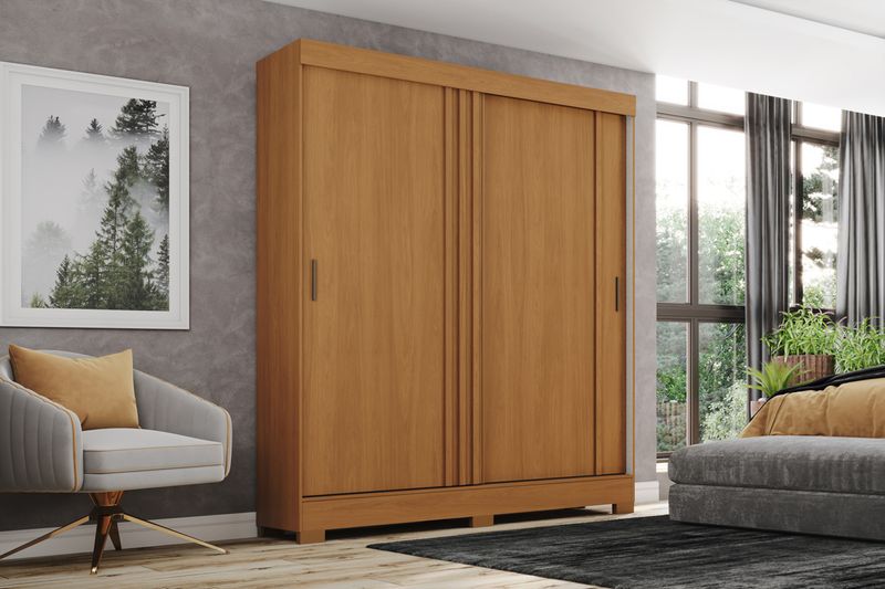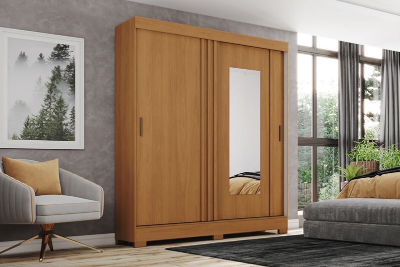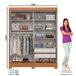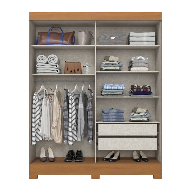 Su interior combina un perchero para ropa colgada con repisas laterales que permiten organizar prendas dobladas, además de cajones internos que facilitan el orden diario.