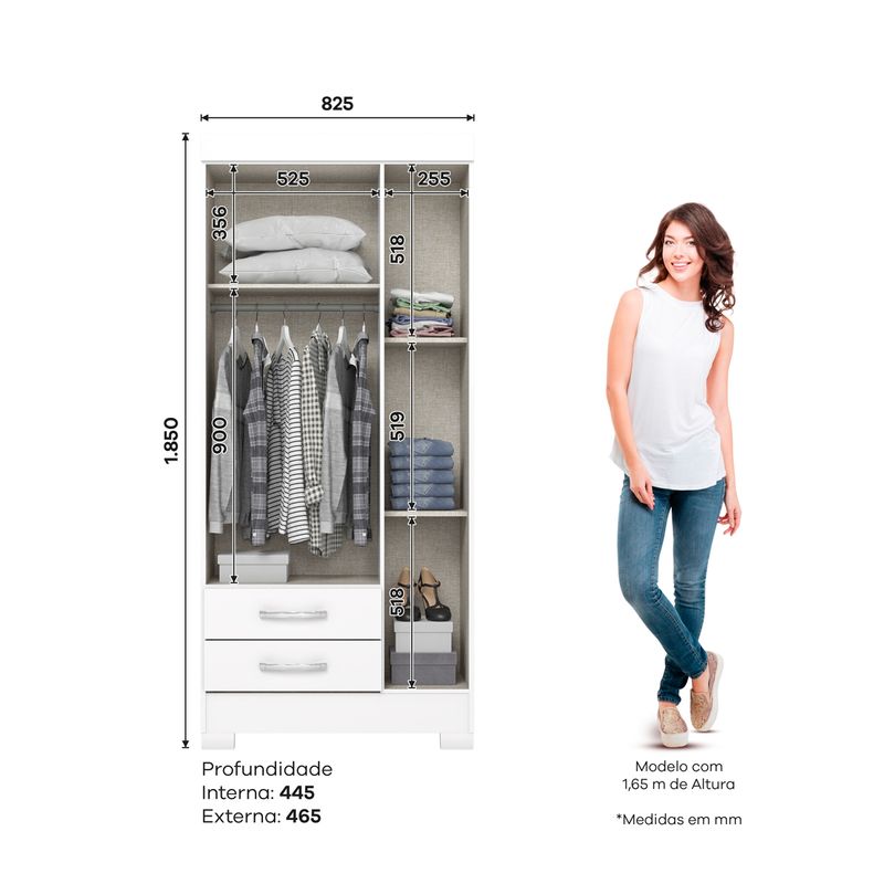 Su lado izquierdo incorpora perchero de gran altura junto a cajones inferiores, mientras que el lado derecho cuenta con estantes ideales para ropa doblada y distintos objetos.