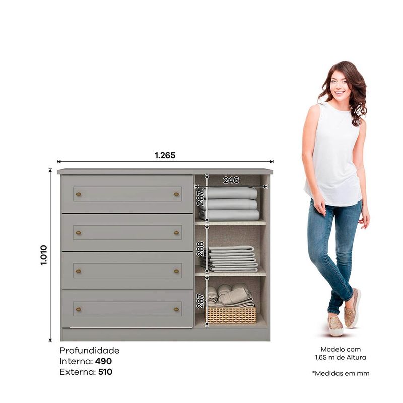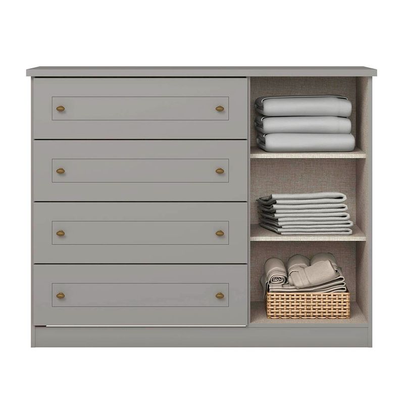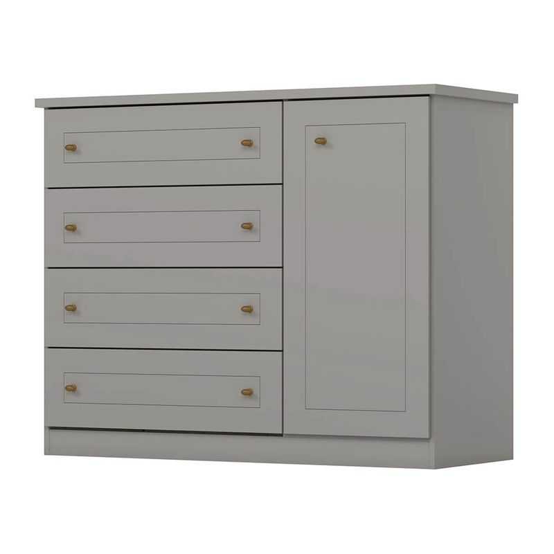 Fabricada para la durabilidad, cuenta con cajones que se deslizan sobre guías metálicas para garantizar un uso suave y prolongado. El acabado Cinza (gris) se complementa elegantemente con los tiradores en color bronce, añadiendo un toque sofisticado al mueble que lo convierte en un punto focal en cualquier dormitorio.