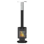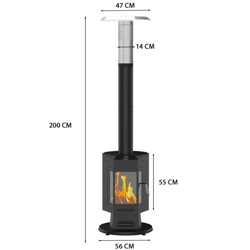 - Materiales: Cuerpo de acero con recubrimiento en polvo negro, tapa de chimenea de acero inoxidable y reflector de aluminio.