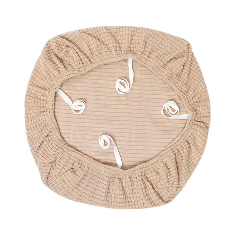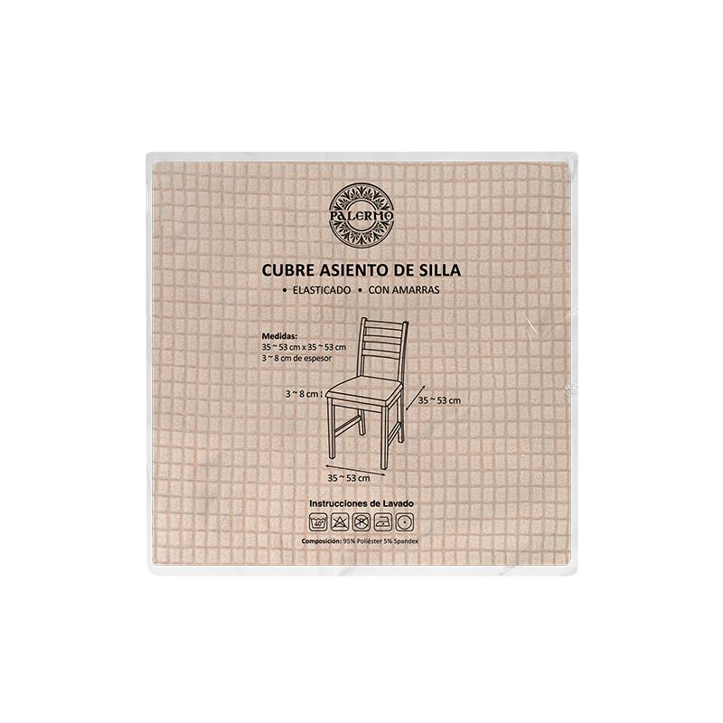 La funda elásticada Palermo en color beige se adapta cómodamente a diversos tipos de sillas gracias a su tela de poliéster y spandex. Su textura cuadrillé realza el espacio con un estilo distinguido y moderno.