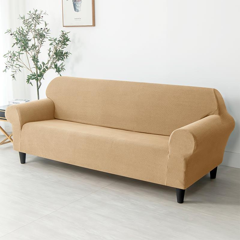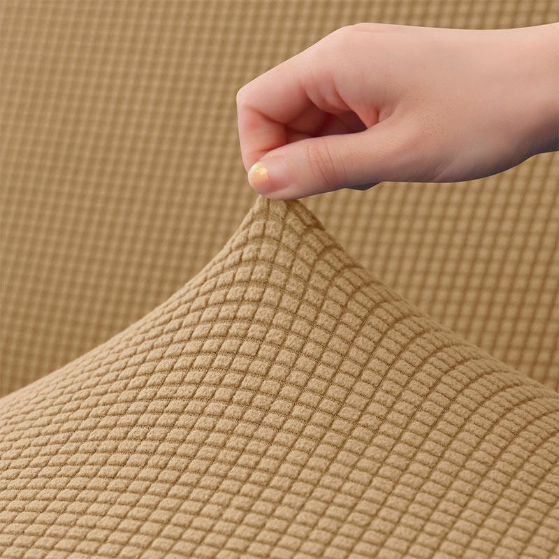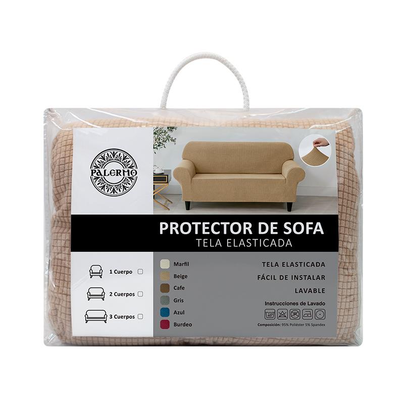 La funda elásticada Palermo para sillón de tres cuerpos, en color beige, está fabricada en poliéster y spandex para asegurar un ajuste flexible y seguro. Su textura cuadrillé aporta un toque moderno y distinguido al espacio.
