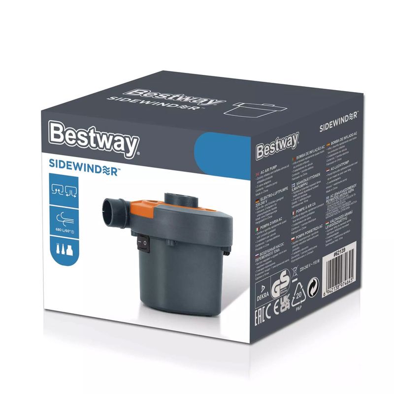 Diseñado para facilitar el inflado de productos inflables, este inflador eléctrico Bestway 220V permite preparar colchones, botes y juguetes de forma rápida y sencilla, ahorrando tiempo y esfuerzo antes de tus actividades.