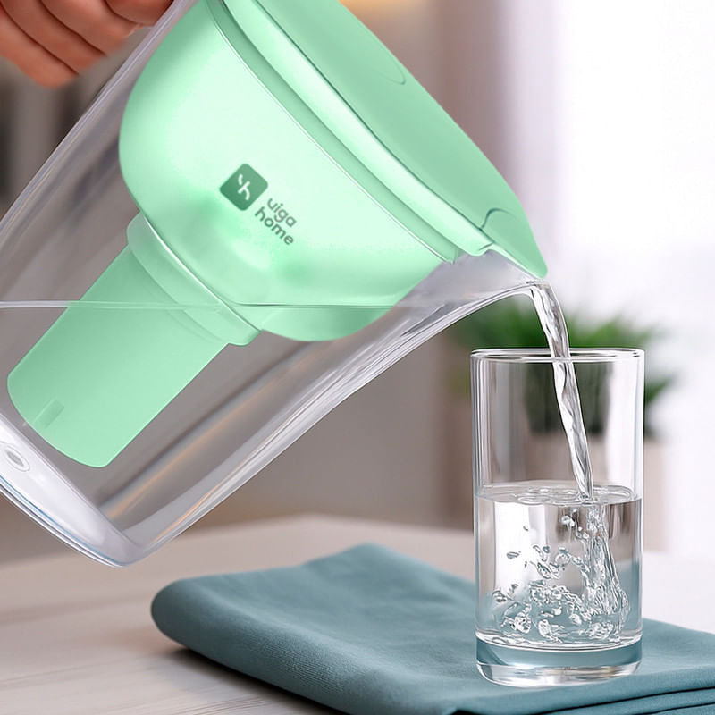 La jarra purificadora de agua Vigahome estándar verde permite disfrutar agua limpia y con mejor sabor cada día, eliminando hasta el 90% del cloro presente en el agua potable.