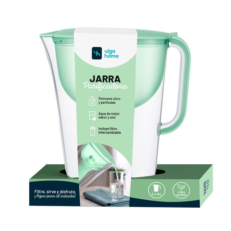 Con una capacidad de 2,4 litros y filtro de carbón de coco de larga duración, es ideal para el uso diario en el hogar. Su diseño libre de BPA y fácil manipulación la convierten en una opción segura, cómoda y eficiente para cuidar tu hidratación.