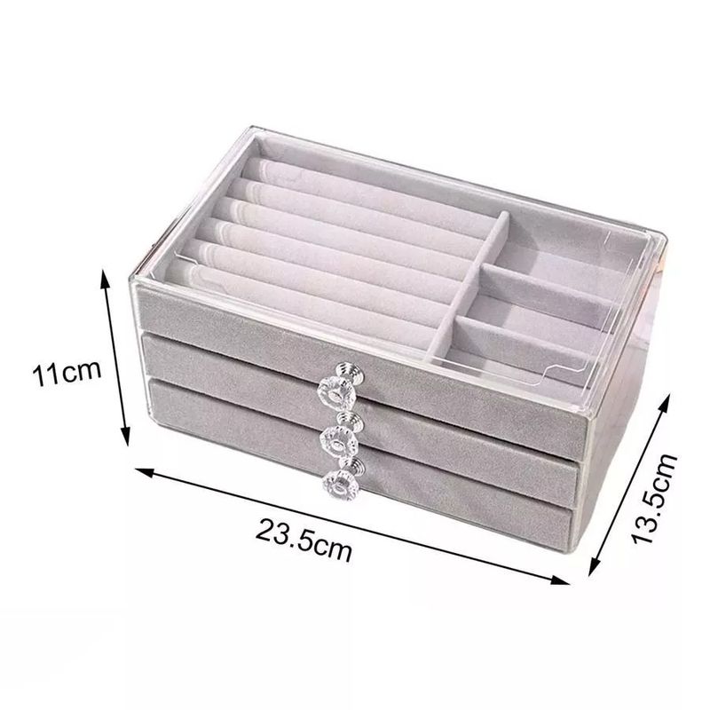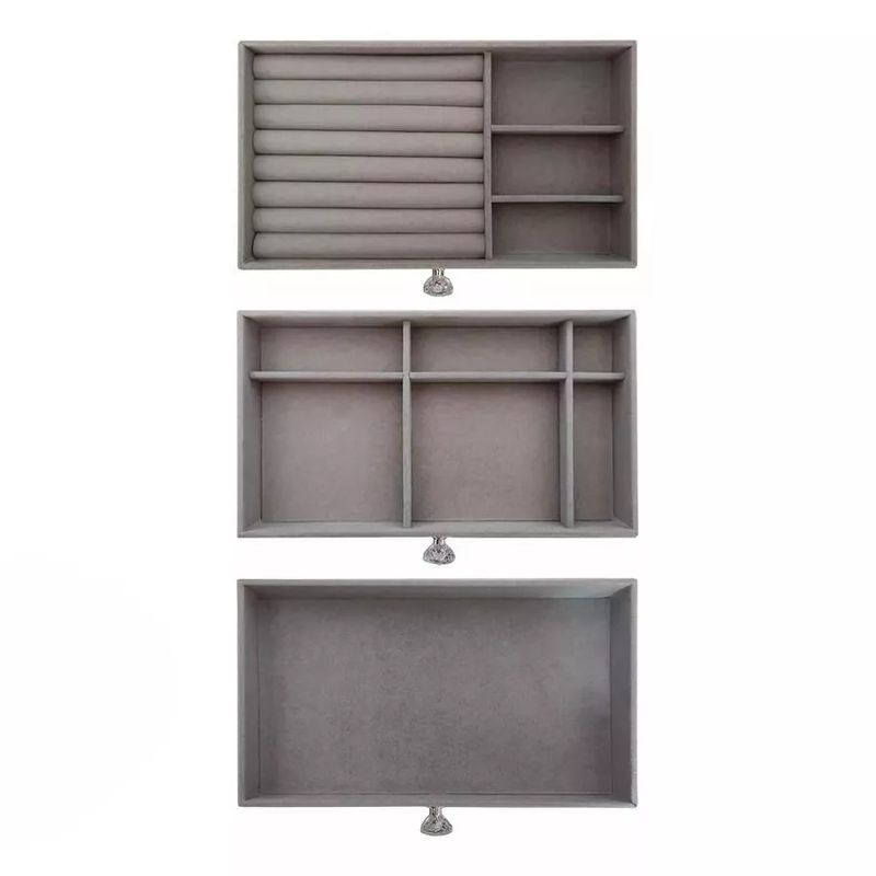 Este elegante soporte cuenta con tres capas de almacenamiento con cajón, ofreciendo versatilidad para diversos tipos de joyas. Su diseño a prueba de polvo y humedad garantiza que sus artículos se mantengan en excelentes condiciones. Además, su apariencia neutra de color gris se adapta a cualquier estilo de decoración, siendo ideal para colocar discretamente en un cajón o como pieza destacada en un tocador.