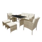 El Juego de Terraza Comedor Bighouse para 7 personas ofrece un diseño elegante con un marco de acero y ratán de alta calidad. Los cojines de espuma de alta densidad proporcionan comodidad, mientras que las fundas extraíbles facilitan la limpieza.