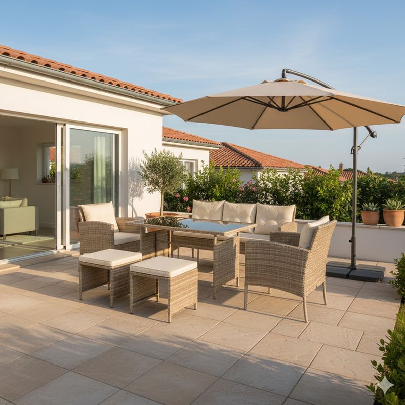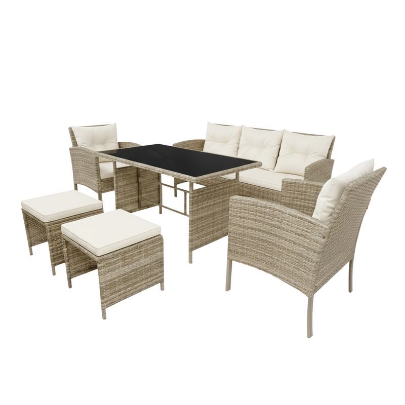 Este conjunto incluye un sofá de 3 plazas, sillones, dos taburetes y una mesa de comedor. Requiere un montaje sencillo y es ideal para comidas al aire libre o reuniones en el jardín.