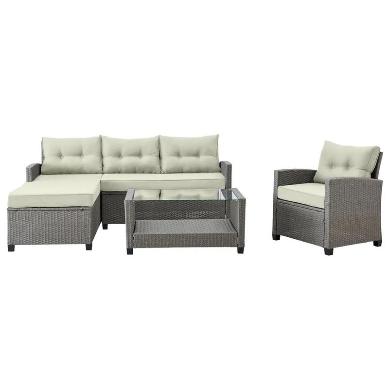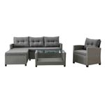 Transforma tu espacio exterior en un elegante rincón de relajación con este juego de living para terraza de Bighouse. Diseñado para acomodar a cuatro personas, el set se compone de un sofá de dos cuerpos, un chaise longue, un sillón individual y una mesa de centro. Fabricado con un tejido de ratán sintético de alta calidad en un clásico tono beige, este conjunto es resistente a la intemperie, lo que garantiza durabilidad y una apariencia impecable por mucho más tiempo.