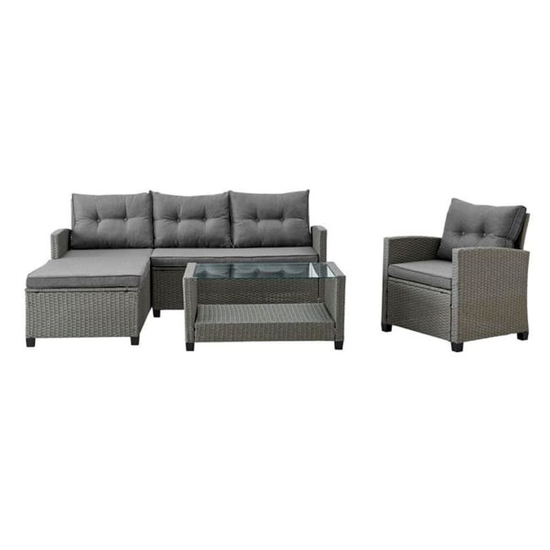 - Materiales: Tejido de ratán sintético, estructura interior de acero, cojines de tela y mesa de vidrio templado.