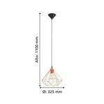 La lámpara colgante TARBES presenta una pantalla de alambre color cobre en forma de diamante con delicados detalles, suspendida de un dosel redondo negro. Al encenderse, la pantalla geométrica crea un efecto fascinante de luces y sombras. Esta lámpara colgante moderna proporciona una iluminación elegante ideal para cualquier espacio, ya sea en la sala, el dormitorio o el comedor. La ampolleta de filamento que se muestra no está incluida, pero la lámpara es compatible con cualquier ampolleta que tenga casquillo E27