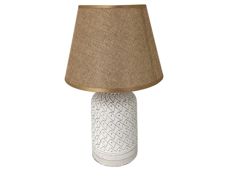 Fabricada en cerámica y tela, ofrece durabilidad y una estética moderna. Su tamaño compacto permite colocarla sobre mesas auxiliares, escritorios o veladores, convirtiéndose en un elemento decorativo que aporta luminosidad y un toque refinado a tu hogar u oficina.