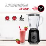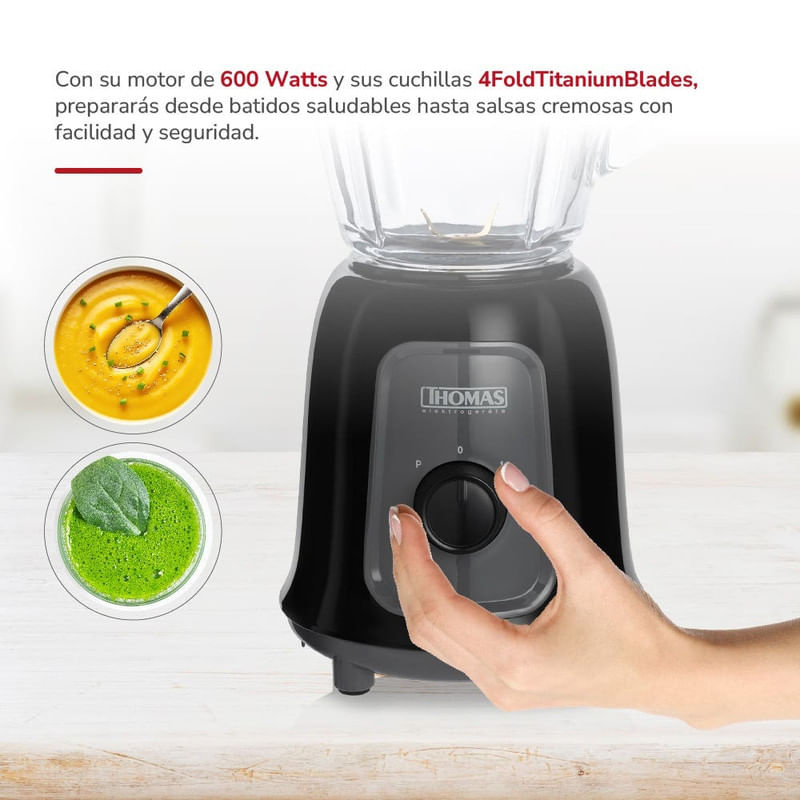 La licuadora Thomas TH-330V combina potencia y precisión con sus cuchillas de acero inoxidable recubiertas en titanio, ideales para batidos, jugos o salsas. Su motor de 600W garantiza un licuado homogéneo incluso con ingredientes duros como hielo o frutas congeladas.
