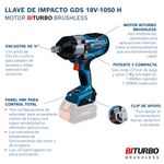 La llave de impacto Bosch GDS 18V-1050 redefine la potencia inalámbrica gracias a su motor BITURBO Brushless, capaz de entregar 1050 Nm de torque y hasta 1700 Nm de fuerza de arranque. Diseñada para trabajos pesados en metal, mecánica, montaje industrial y construcción.