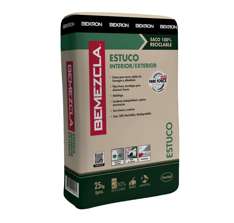 El mortero estuco exterior Bemezcla es un mortero cementicio predosificado formulado especialmente para muros exteriores, incorporando tecnología Fibre-Force que reduce fisuras y mejora la resistencia del estuco.