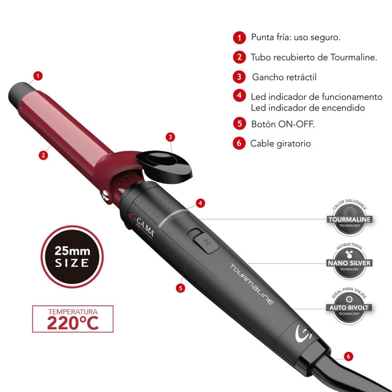 El ondulador de cabello Gama New Tour RGSTD-N de 25 mm ofrece resultados profesionales con su tecnología Tourmaline Ion, que protege la fibra capilar del calor y genera un brillo natural. Su tubo recubierto en turmalina distribuye el calor de forma uniforme, logrando rizos suaves y definidos sin dañar el cabello.