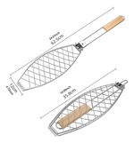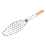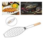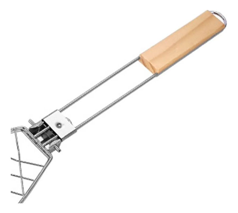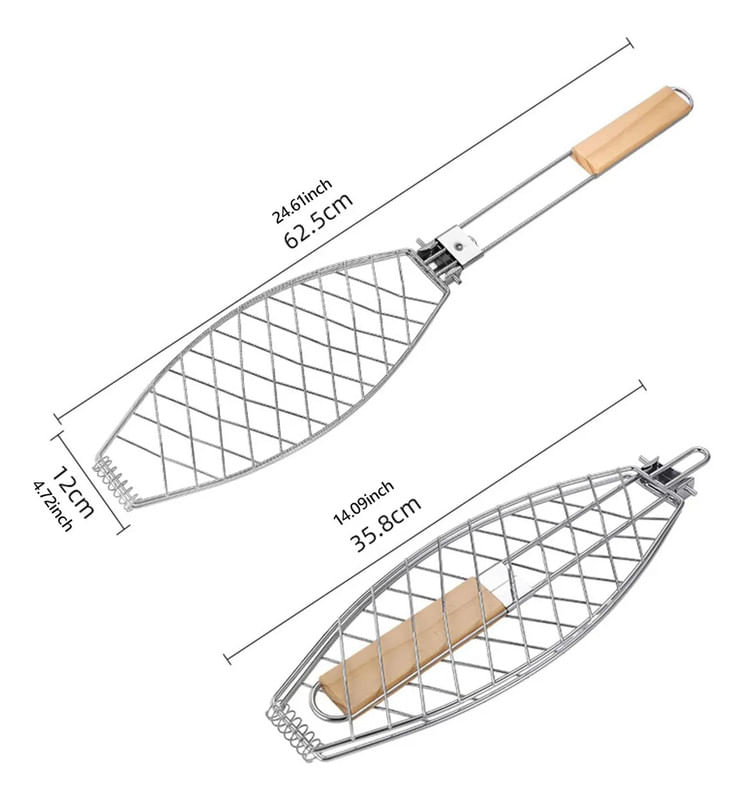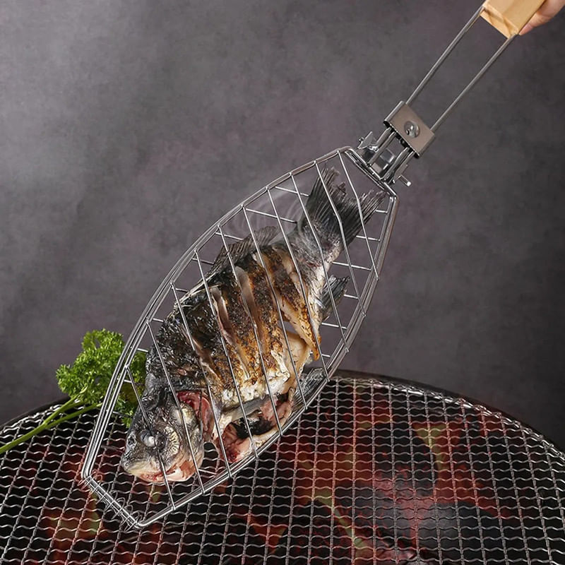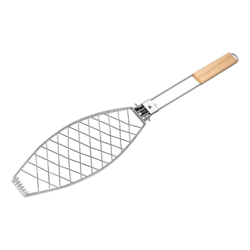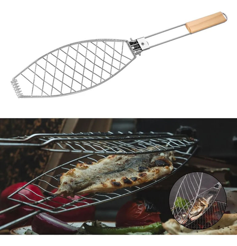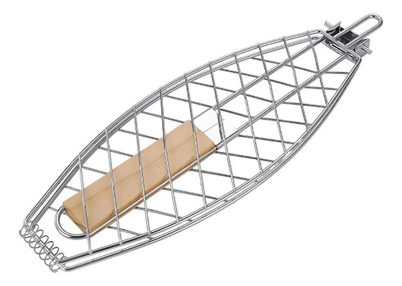 La parrilla para pescado está diseñada para asar de forma uniforme y segura distintos tipos de pescado. Su forma ovalada se adapta a la silueta del alimento, manteniéndolo firme durante la cocción. La estructura de alambre resistente permite un calentamiento parejo. Ideal para parrillas y asados.