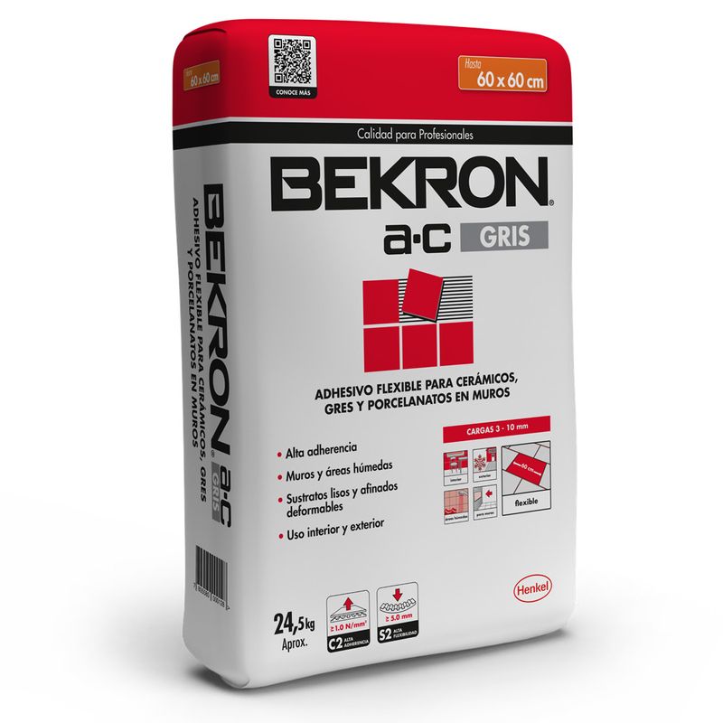 El adhesivo en polvo Bekron AC Gris ofrece una fijación profesional para cerámicos, gres y porcelanatos de gran formato. Su formulación de alta adherencia asegura un agarre inicial potente, ideal para instalaciones verticales y horizontales en interiores o exteriores.
