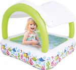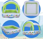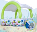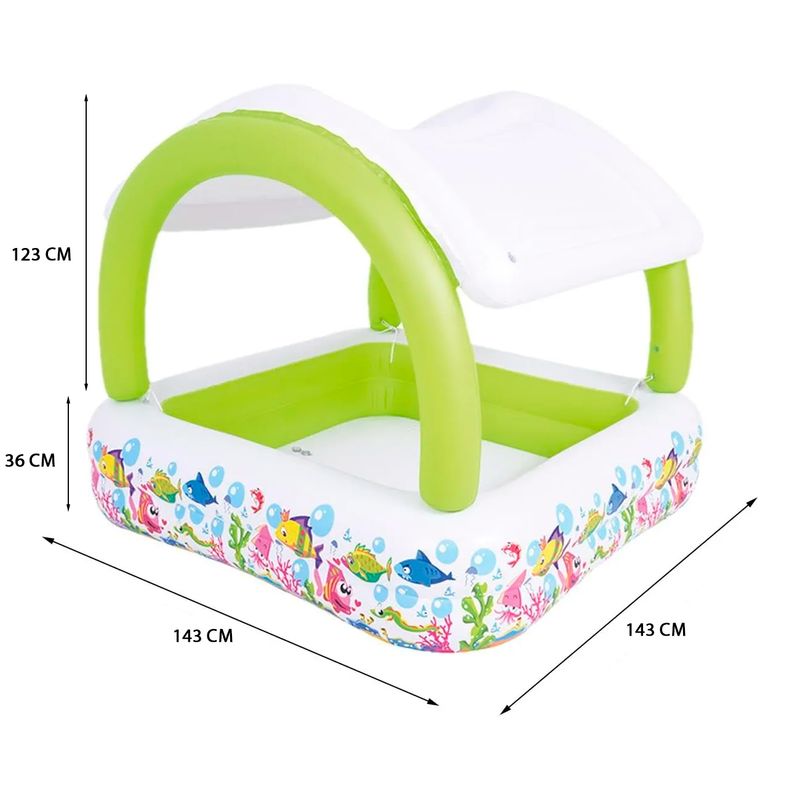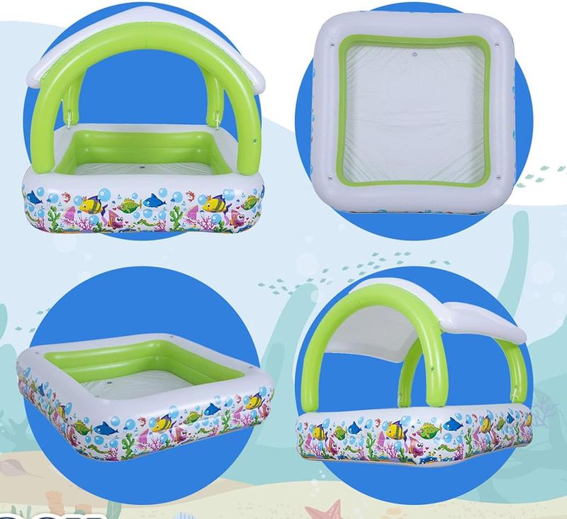 La piscina inflable para bebé con techo ofrece un espacio seguro y entretenido para que los niños disfruten del agua. Su diseño tipo casita con motivo de pez crea una experiencia lúdica que los pequeños amarán.