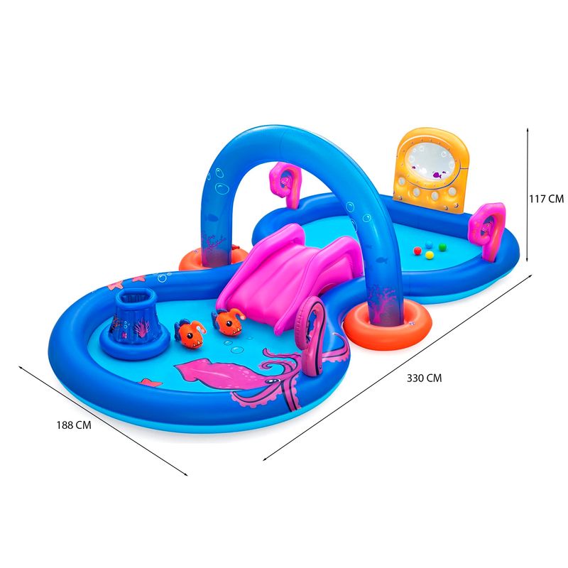 La piscina inflable Pulpo de 330x188x117 cm transforma tu jardín en un completo centro de entretención acuática, ofreciendo juegos, aspersor y tobogán para horas de diversión segura.