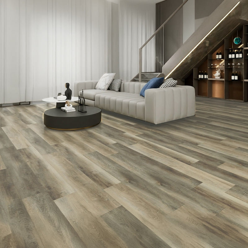 Piso vinílico SPC con look madera y manta acústica integrada