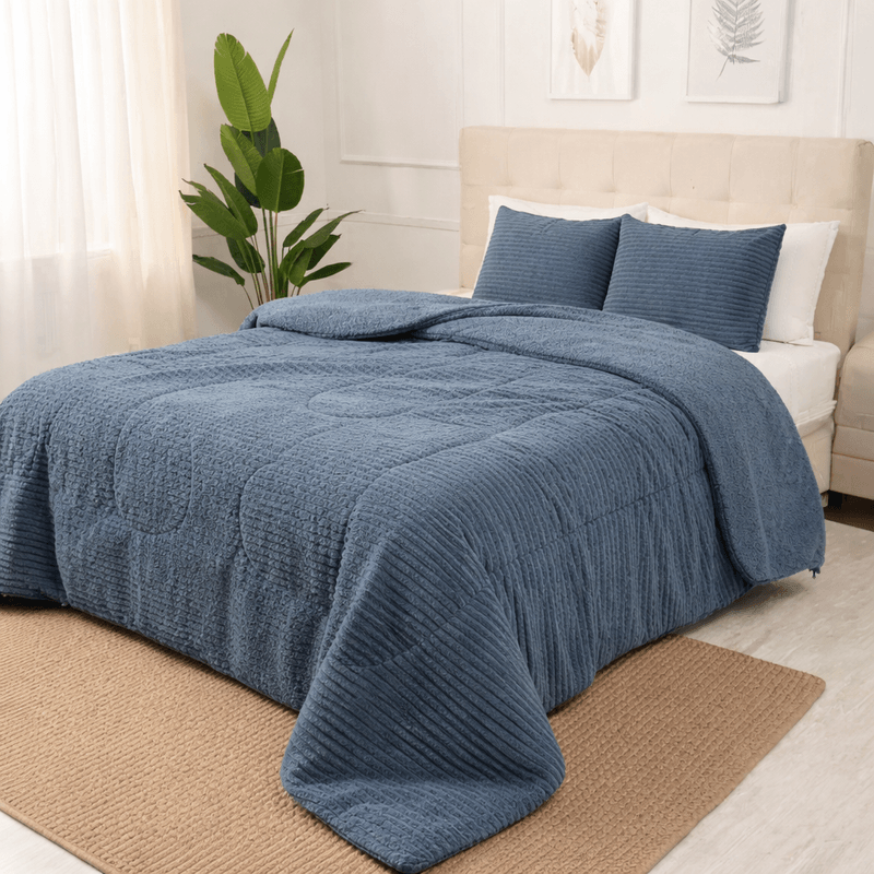 Con dimensiones amplias de 270 x 245 cm, brinda una cobertura total para camas super king, aportando comodidad y un estilo acogedor al dormitorio. La combinación de flannel jacquard y reverso sherpa proporciona una textura suave y agradable al tacto, mientras que las fundas incluidas completan un set pensado para el máximo confort.