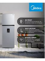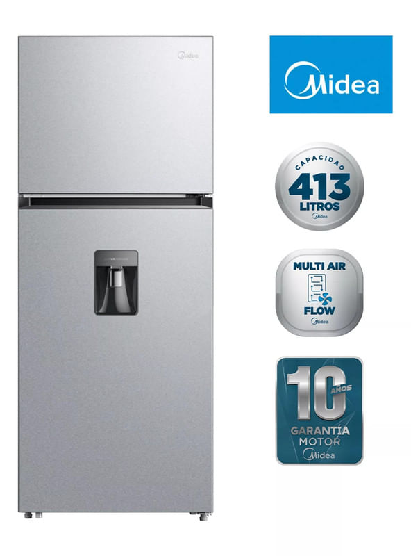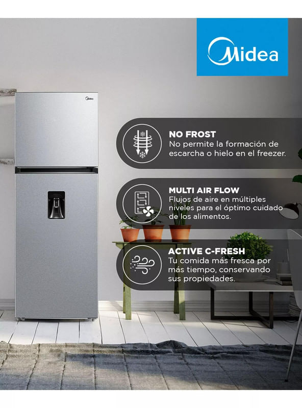 El refrigerador Midea Top Mount de 407 litros ofrece una excelente capacidad de almacenamiento y un sistema de enfriamiento No Frost que mantiene los alimentos frescos por más tiempo. Su tecnología Multi Air Flow distribuye el aire de manera uniforme, asegurando una temperatura estable en todos los compartimentos.