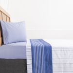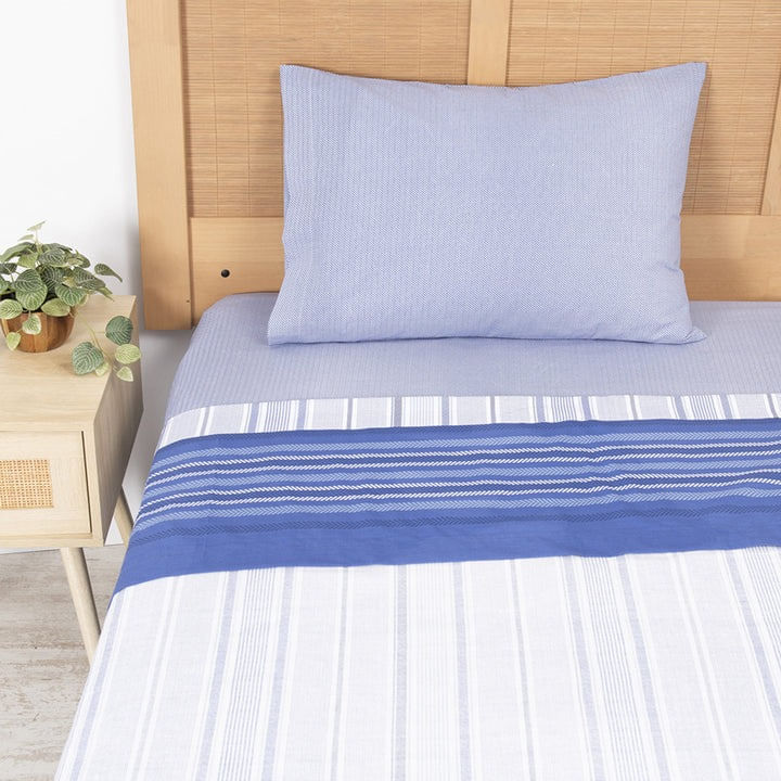 Este juego de sábanas Mashini combina la frescura del algodón con la resistencia del poliéster, entregando una textura suave y durable ideal para el uso diario. Su diseño Lines aporta un toque moderno y elegante que renueva cualquier ambiente.