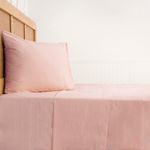 La sábana Mashini de 1 plaza y 180 hilos está confeccionada con una mezcla de poliéster y algodón que entrega una textura suave y agradable para el descanso diario. Su diseño liso en color rosado aporta un toque cálido y decorativo al dormitorio.