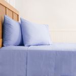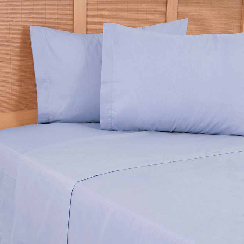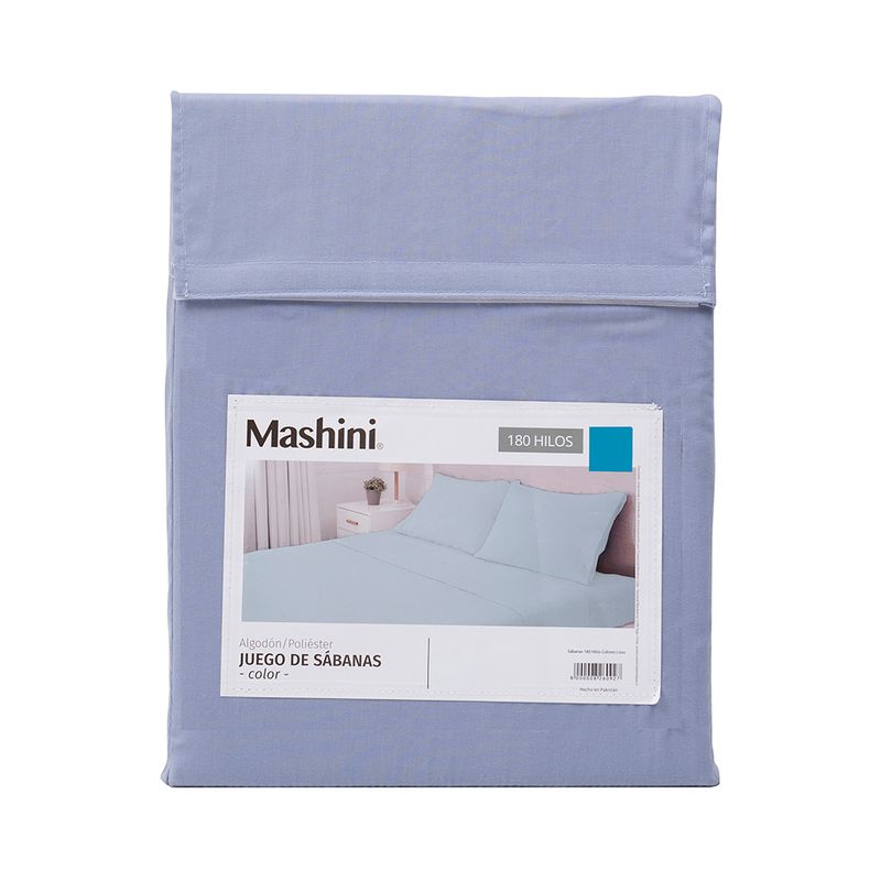 La sábana Mashini de 2 plazas y 180 hilos está confeccionada con una mezcla de poliéster y algodón que ofrece una textura suave y agradable para el descanso diario. Su diseño liso en color azul aporta un estilo moderno que combina fácilmente con distintos ambientes.