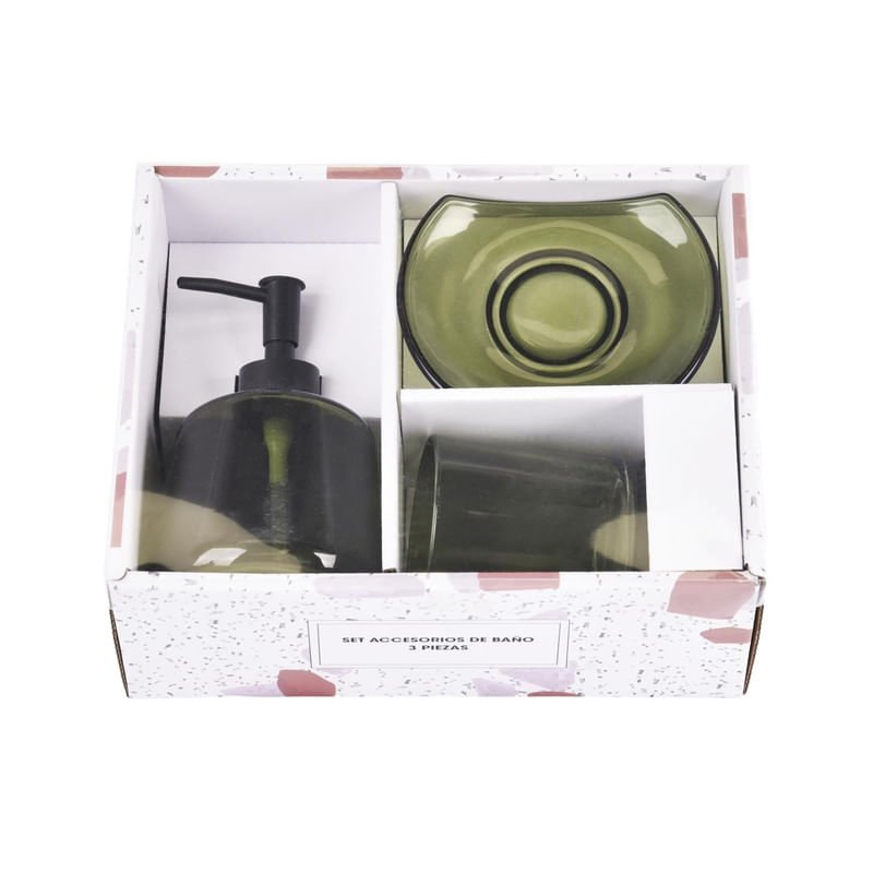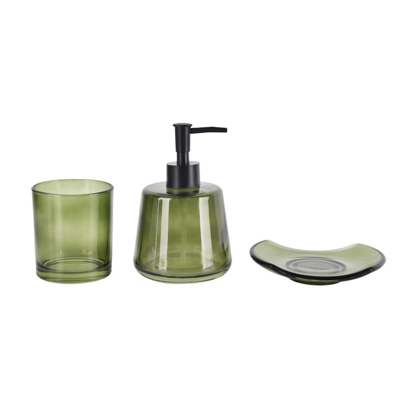 El set de accesorios de baño Chantilly Ilusión verde de 3 piezas combina diseño y funcionalidad, aportando un estilo moderno con su acabado translúcido y efecto brillante. Perfecto para complementar cualquier decoración de baño.