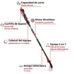 Cuenta con cuchillas bypass de acero SK5 que ofrecen cortes limpios y eficientes en ramas de hasta 28 mm de grosor. Su cabezal ajustable en 7 posiciones y el gancho metálico integrado facilitan el trabajo en altura, permitiendo retirar las ramas cortadas con mayor comodidad.