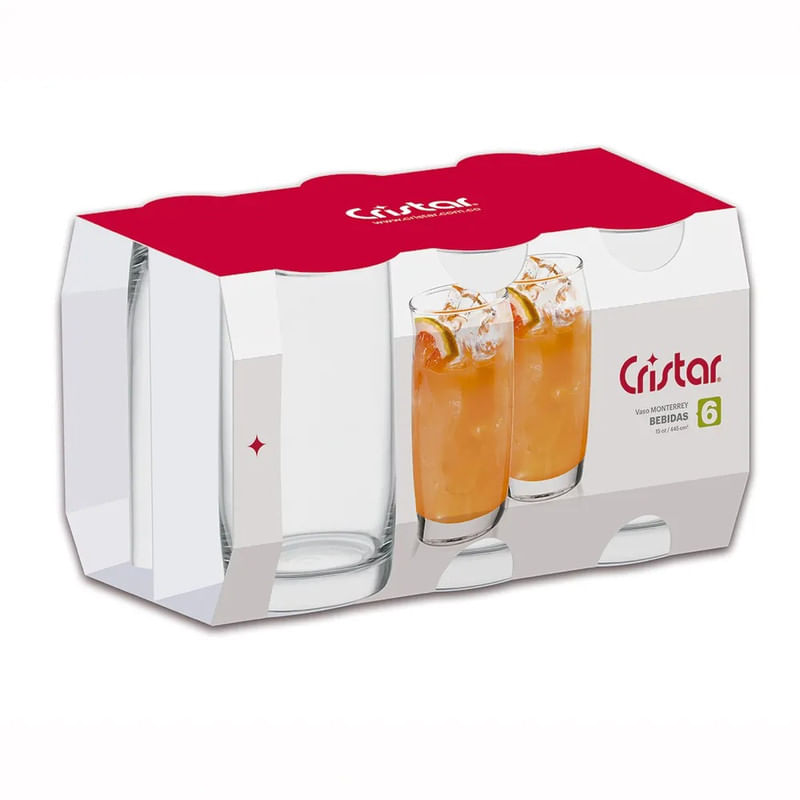 El set de vasos altos Monterrey Cristar de 445 cc combina un diseño clásico con un acabado brillante que realza la presentación de tus bebidas. Su formato alto es ideal para servir jugos, bebidas refrescantes, cócteles o tragos largos en cualquier ocasión.